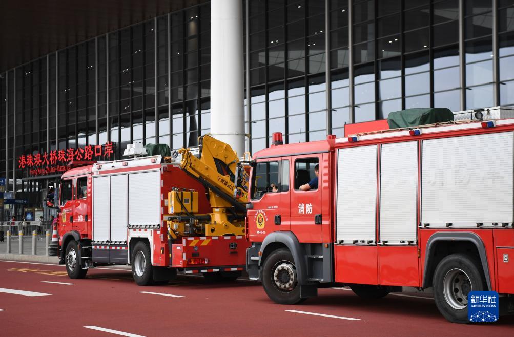 11月7日在港珠澳大橋珠海公路口岸拍攝的參加演練的消防車(chē)輛。