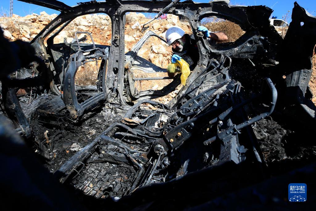 11月6日,在黎巴嫩南部艾納塔,工作人員檢查被以色列無(wú)人機炸毀的車(chē)輛殘骸。
