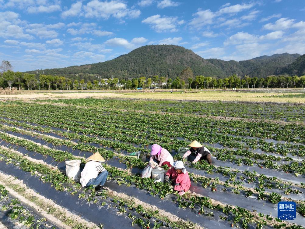 11月7日,在云南省騰沖市和順鎮,農民在田間管護草莓苗(無(wú)人機照片)。