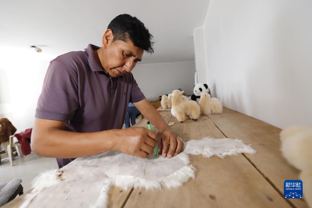 在秘魯南部城市阿雷基帕的工坊內,馬馬尼大叔制作羊駝手工藝品(10月27日攝)。