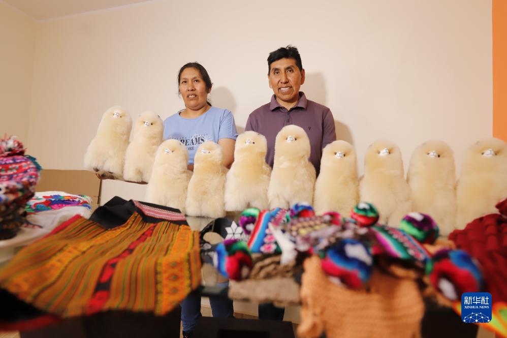 在秘魯南部城市阿雷基帕的工坊內,馬馬尼大叔(右)和妻子格洛麗亞展示羊駝玩偶和其他秘魯特色手工藝品(10月27日攝)。