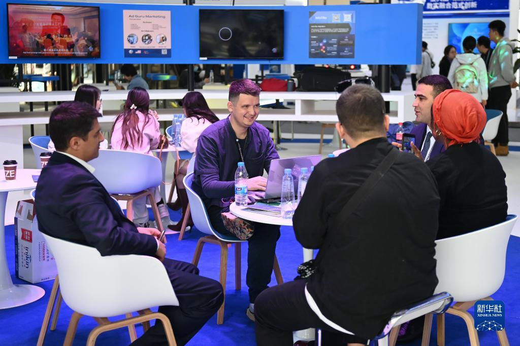 11月7日,“互聯(lián)網(wǎng)之光”博覽會(huì )境外展區的參展商代表在洽談區交流。