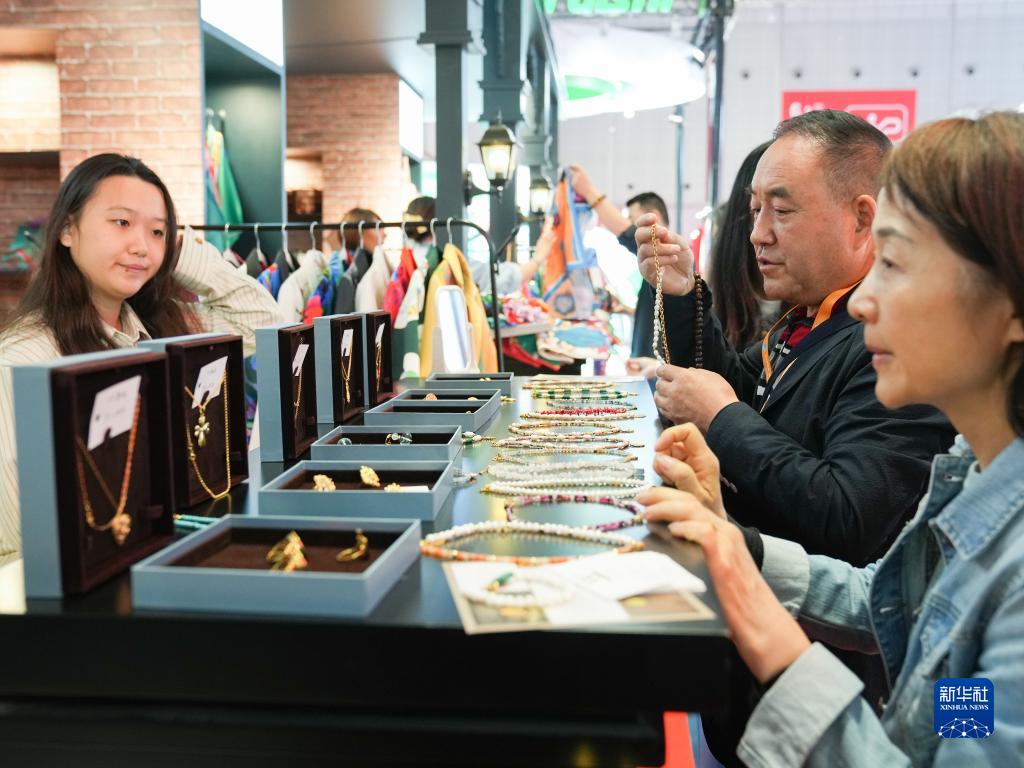 11月7日,在第六屆進(jìn)博會(huì )消費品展區,參觀(guān)者在挑選來(lái)自格魯吉亞的項鏈。