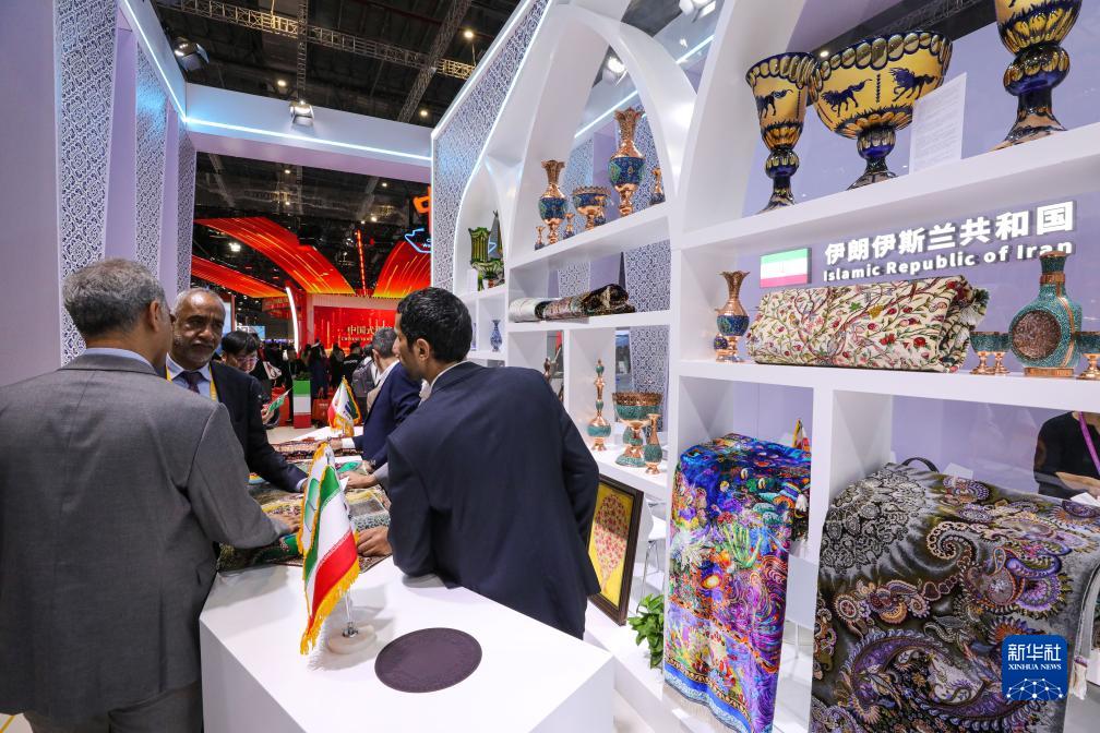 11月6日,參觀(guān)者在第六屆進(jìn)博會(huì )國家展伊朗展臺與展商交談。