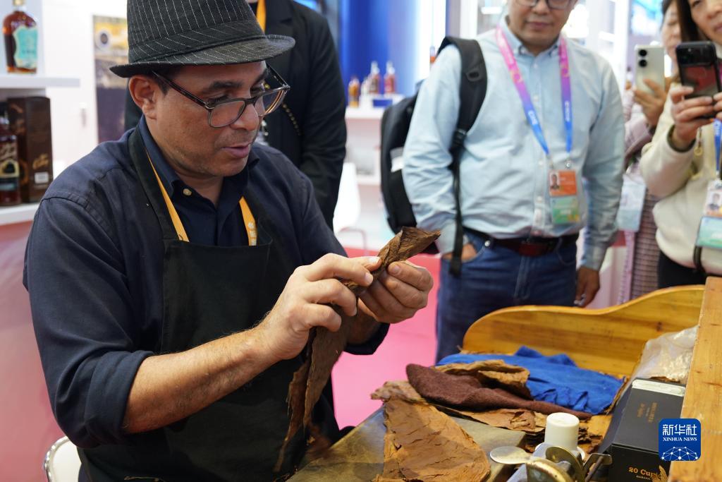 11月7日,展商在第六屆進(jìn)博會(huì )國家展古巴展臺為觀(guān)眾演示雪茄制作工藝。