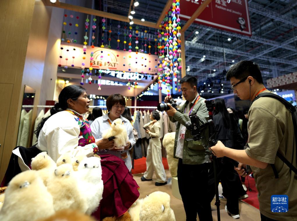 11月7日,在第六屆進(jìn)博會(huì )消費品展區“溫暖駝”展臺,秘魯手工藝人接受媒體采訪(fǎng)。