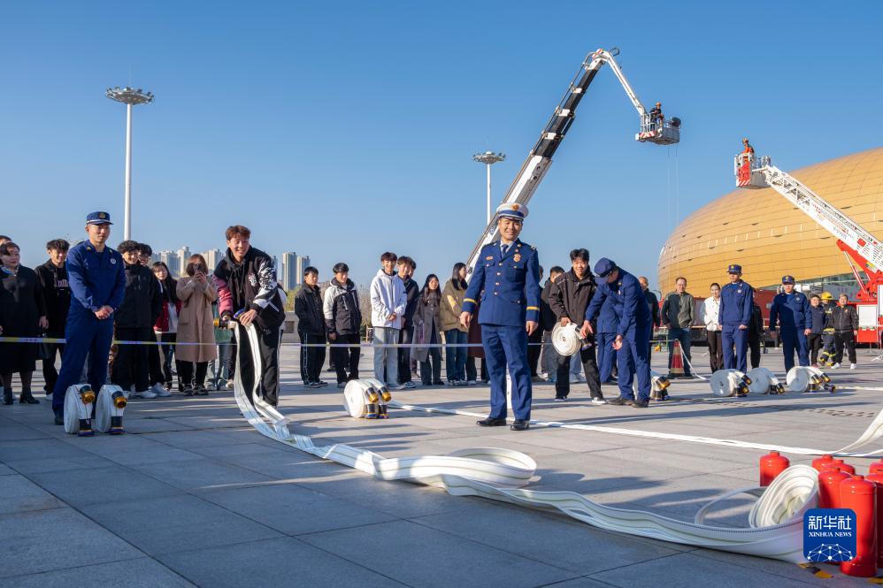 11月7日,在河南省三門(mén)峽市消防安全月啟動(dòng)儀式現場(chǎng),市民在消防救援隊員指導下體驗使用消防器材。