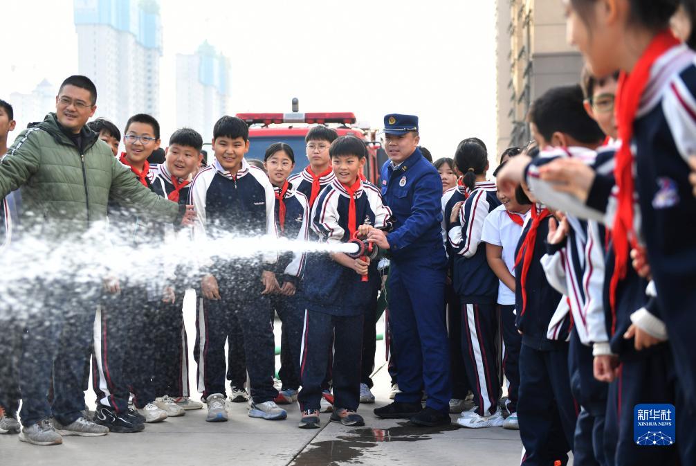 11月7日,在河北省邯鄲市經(jīng)開(kāi)區實(shí)驗學(xué)校小學(xué)部,小學(xué)生在消防救援隊員的輔導下體驗使用消防水槍。