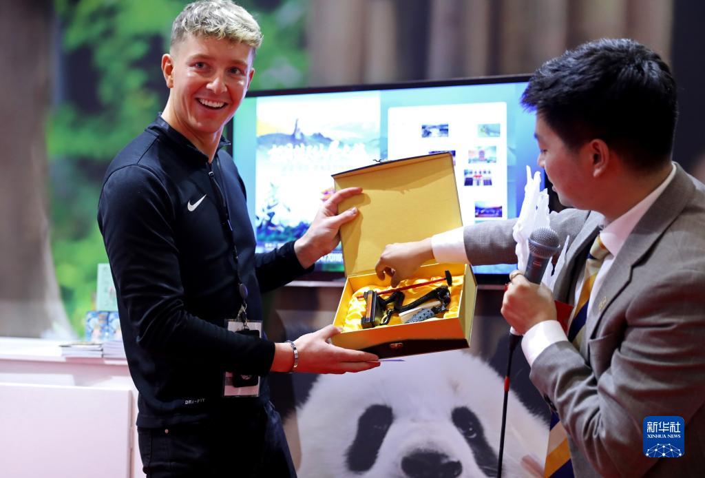 11月6日,在英國倫敦世界旅游交易會(huì )中國展區,一名男子獲得文創(chuàng )禮物。