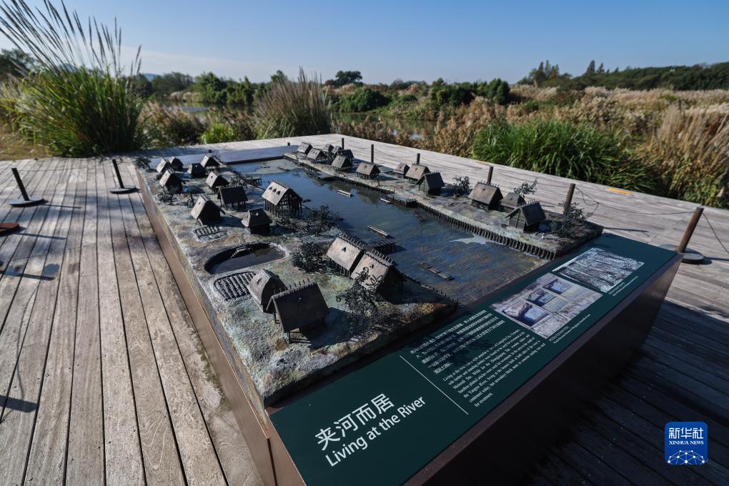 11月7日拍攝的良渚古城遺址公園鐘家港古河道旁的良渚先民夾河而居的模型展示區。