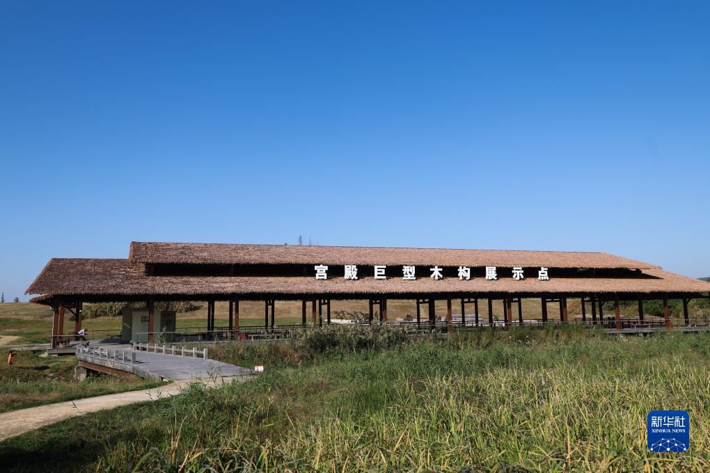 11月7日拍攝的良渚古城遺址公園內的宮殿巨型木構展示點(diǎn)。
