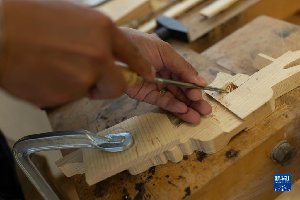10月10日,在斯洛文尼亞盧布爾雅那的民族志博物館,故宮博物院專(zhuān)家鮑杰制作大門(mén)模型缺失的部件。