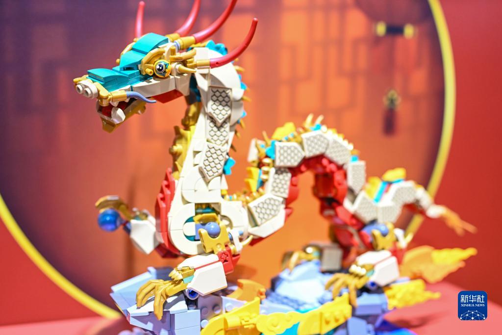11月6日在第六屆進(jìn)博會(huì )消費品展區樂(lè )高集團展臺拍攝的首次亮相的春節祥龍納福玩具套裝。