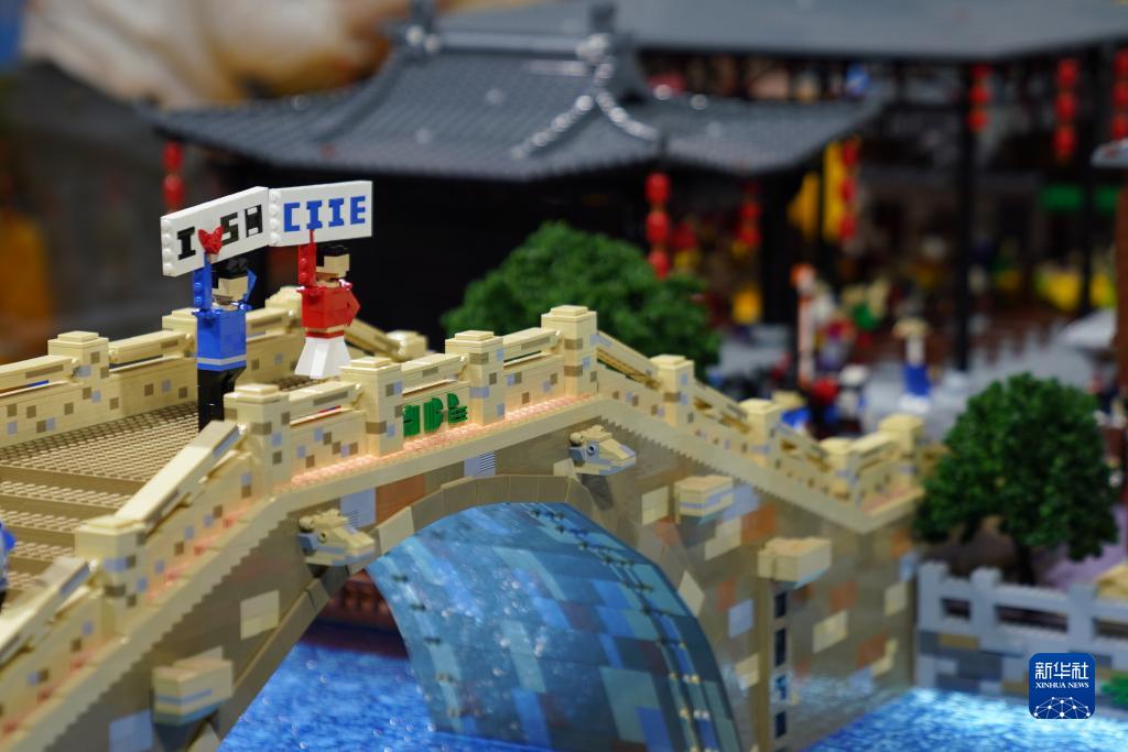 11月7日在第六屆進(jìn)博會(huì )消費品展區樂(lè )高集團展臺拍攝的楓涇古鎮樂(lè )高模型。