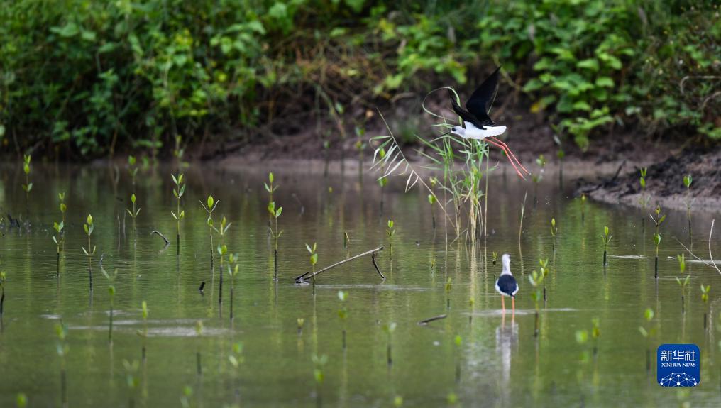 11月8日,一只黑翅長(cháng)腳鷸在海南東寨港(三江灣)生態(tài)修復項目種植的紅樹(shù)林上飛翔。