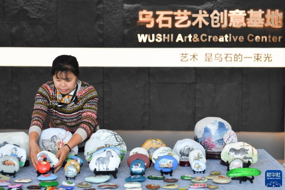 11月8日,在湖南省瀏陽(yáng)市小河鄉烏石村的烏石當代藝術(shù)館,農民在整理石頭畫(huà)。