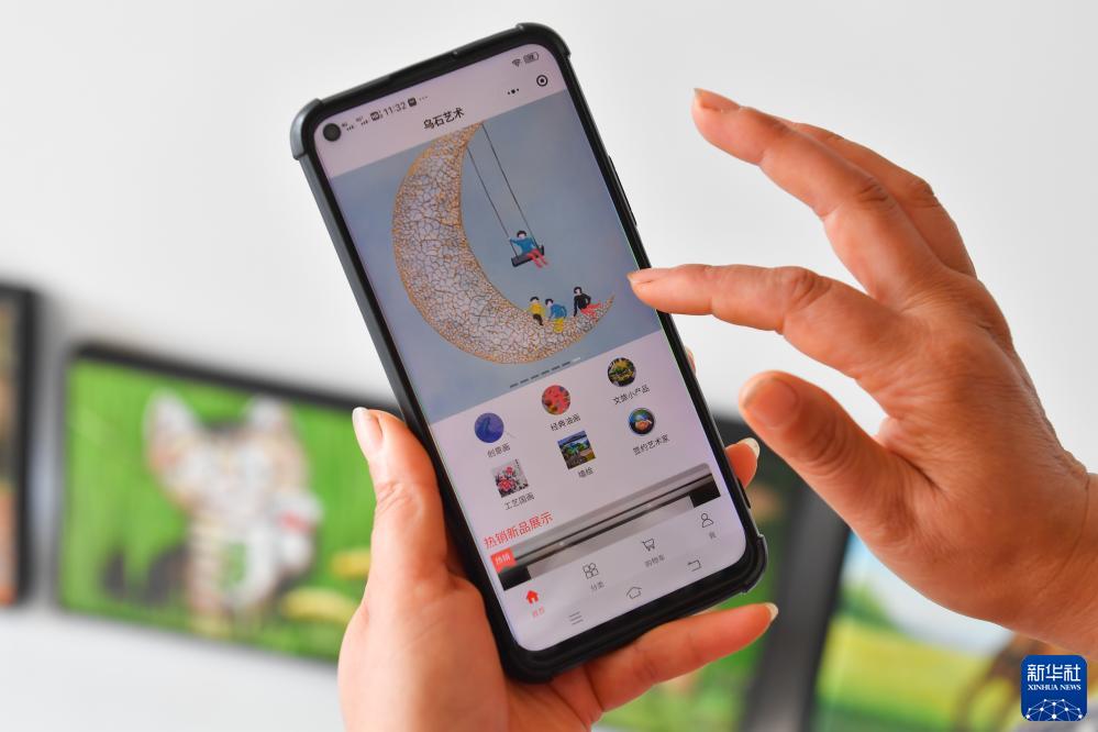 11月8日,在湖南省瀏陽(yáng)市小河鄉烏石村的烏石當代藝術(shù)館,農民演示如何通過(guò)“烏石藝術(shù)”小程序購買(mǎi)油畫(huà).