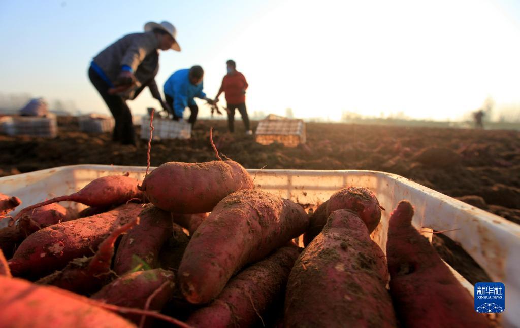 11月8日,山東省臨沂市平邑縣地方鎮農民在田間收獲晚茬紅薯。