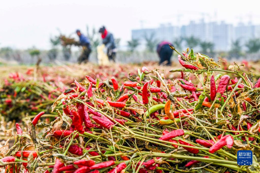 11月8日,農民在河北省遵化市一家蔬菜專(zhuān)業(yè)合作社種植基地收獲辣椒。