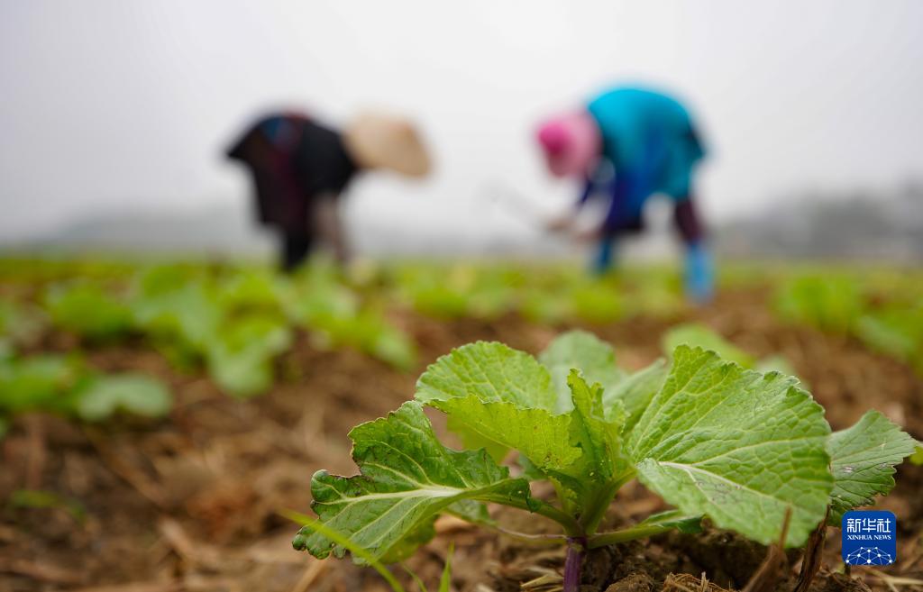 11月8日,在貴州省黔東南苗族侗族自治州丹寨縣揚武鎮長(cháng)青社區,村民在田間管護青菜苗。