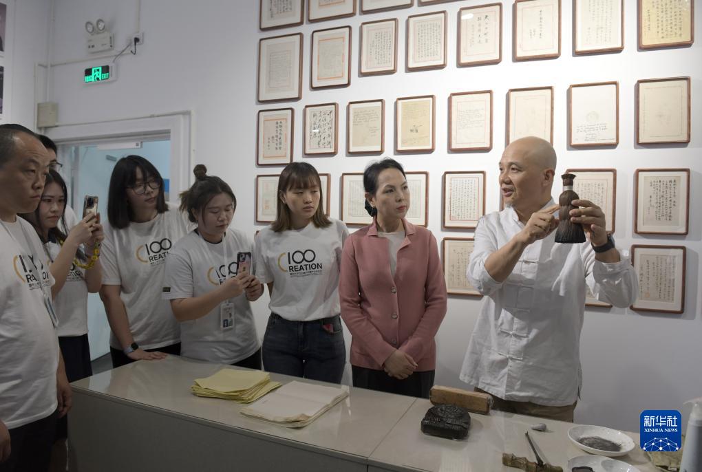 11月8日,魏立中(右一)為師生介紹制作木版水印的技藝。