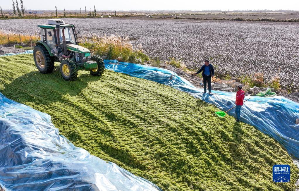 在新疆尉犁縣巴西買(mǎi)里村,爾肯(右二)查看青貯玉米儲存情況(10月24日攝,無(wú)人機照片)。