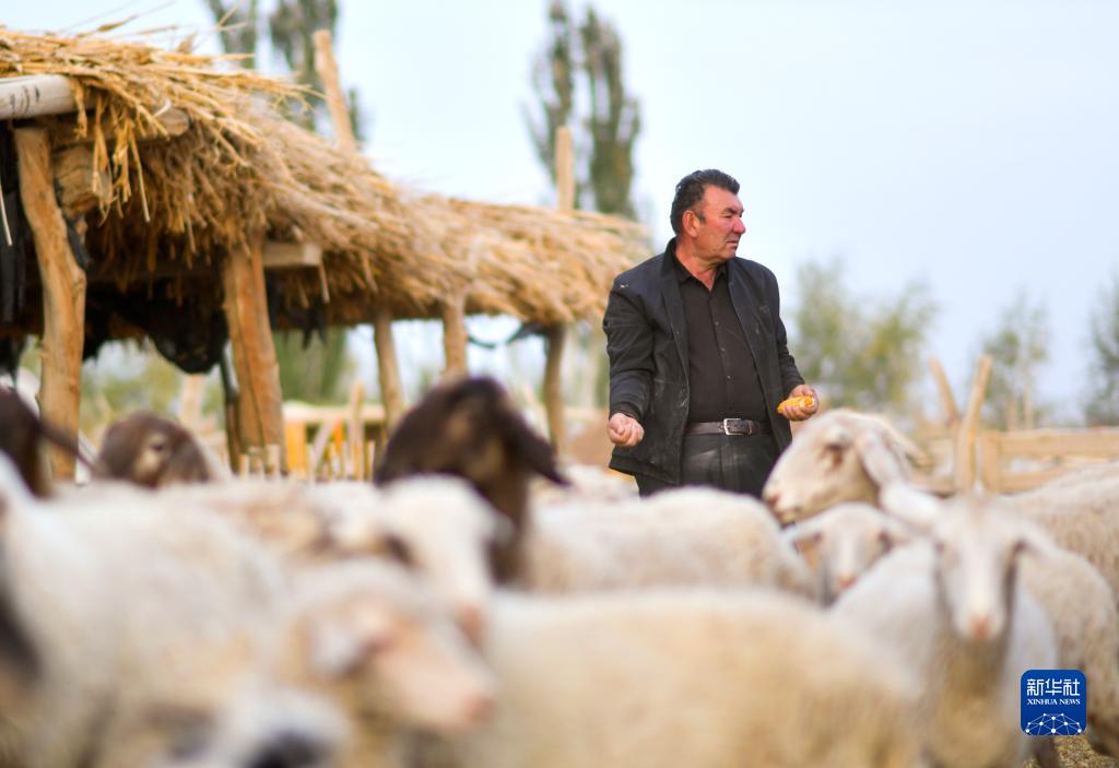 在新疆尉犁縣巴西買(mǎi)里村,爾肯給羊群喂玉米(10月19日攝)。