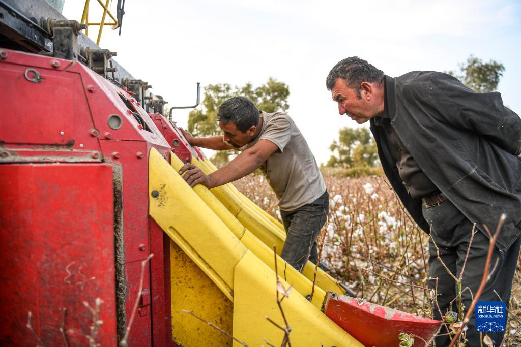 在新疆尉犁縣巴西買(mǎi)里村,爾肯在自家的棉田中查看采棉作業(yè)(10月20日攝)。