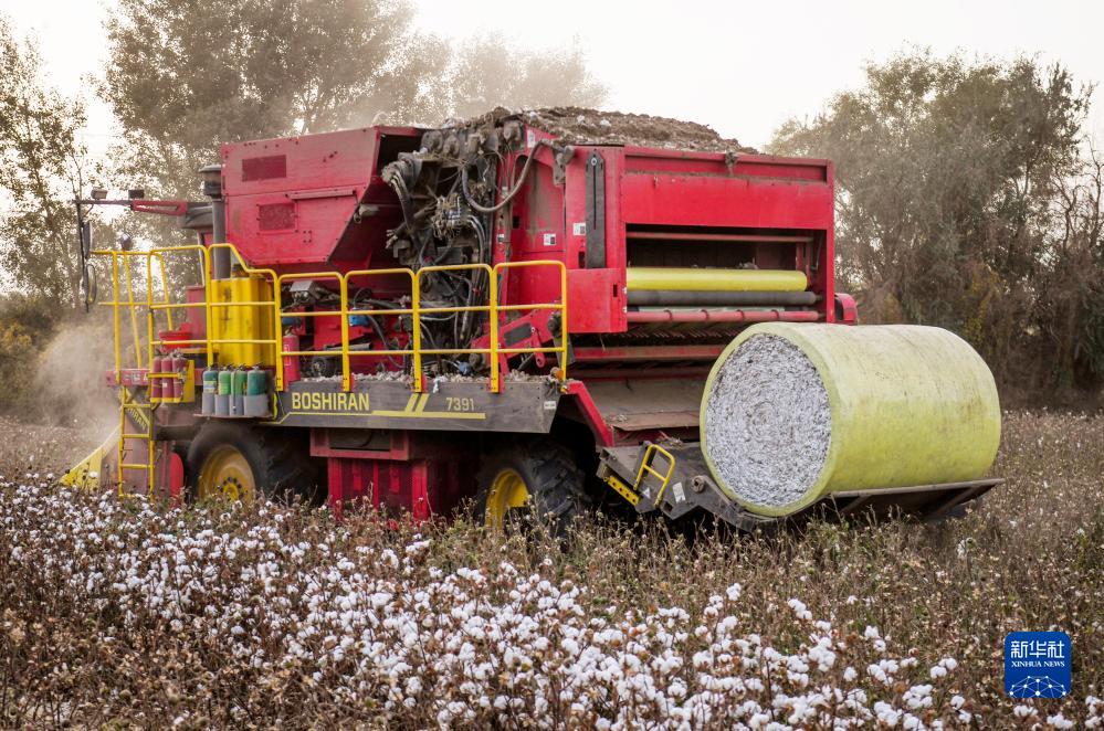 在新疆尉犁縣,農機手駕駛采棉機打包棉包(10月20日攝)。