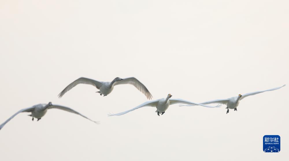 11月9日,大天鵝在三門(mén)峽市天鵝湖國家城市濕地公園上空飛翔。