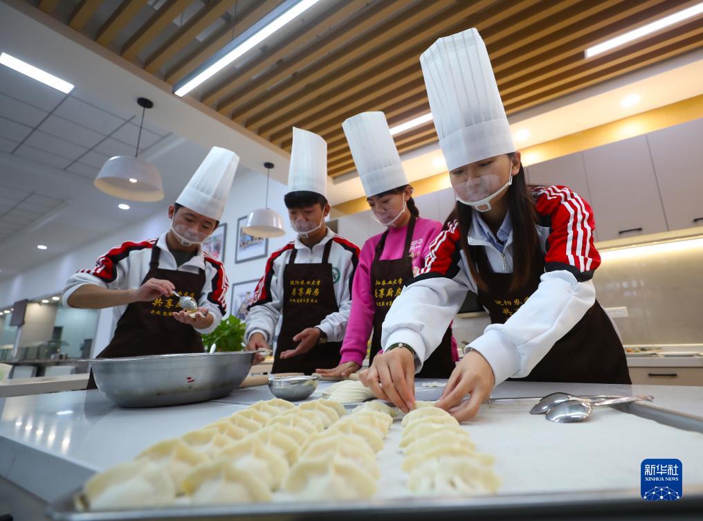 11月9日,在沈陽(yáng)農業(yè)大學(xué)一食堂,學(xué)生在共享廚房學(xué)習包餃子。