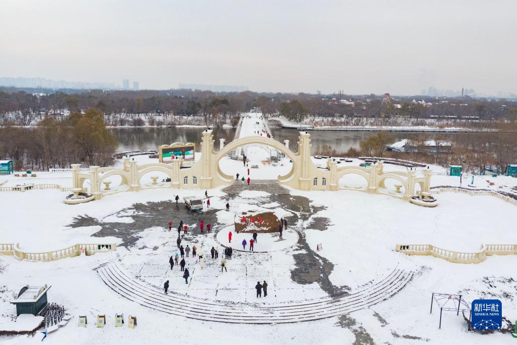 11月9日,人們在太陽(yáng)島景區門(mén)前清掃積雪、游玩拍照(無(wú)人機照片)。
