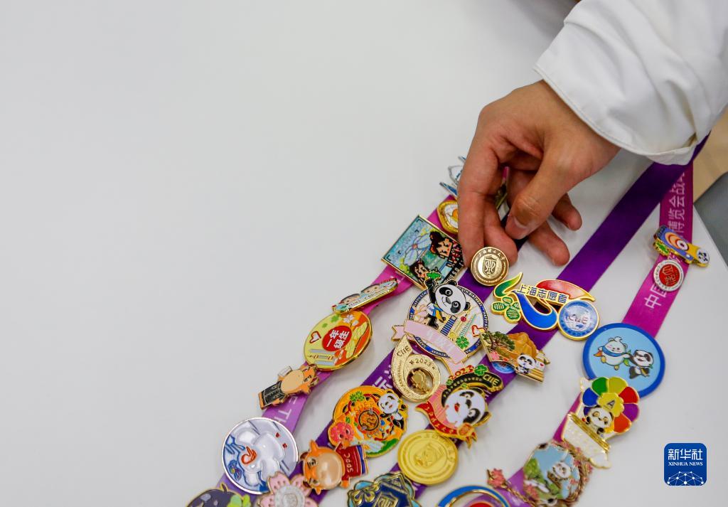 11月7日,在第六屆進(jìn)博會(huì )上,上海理工大學(xué)志愿者楊宇晨展示收集的徽章。近年,進(jìn)博會(huì )“徽章文化”日益流行,在進(jìn)博會(huì )上交換收集徽章成為不同高校志愿者、展商和參展者結交新朋友的方式。