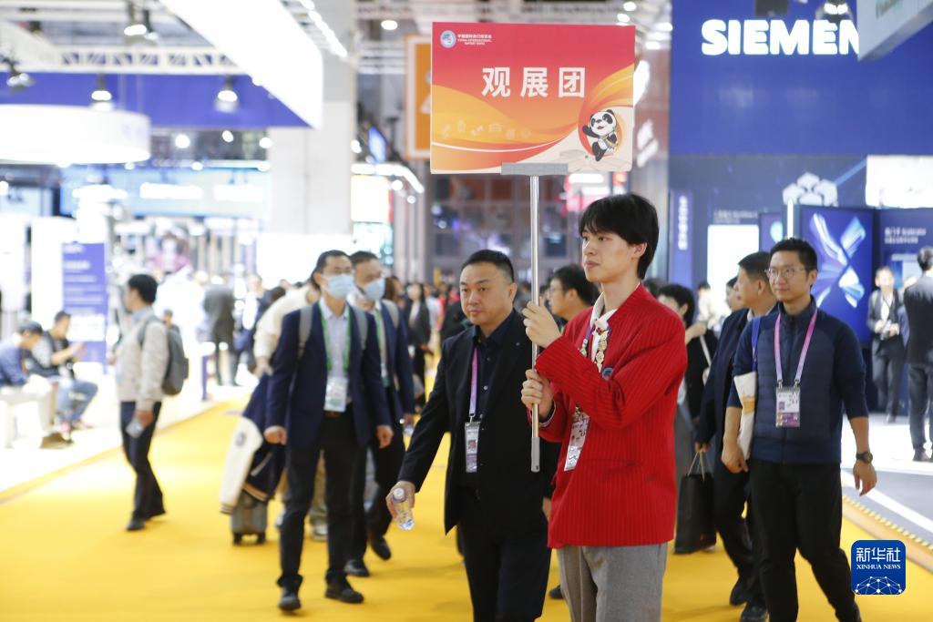 11月7日,在第六屆進(jìn)博會(huì )上,上海理工大學(xué)志愿者潘奕帆引導觀(guān)展團參觀(guān)展區。