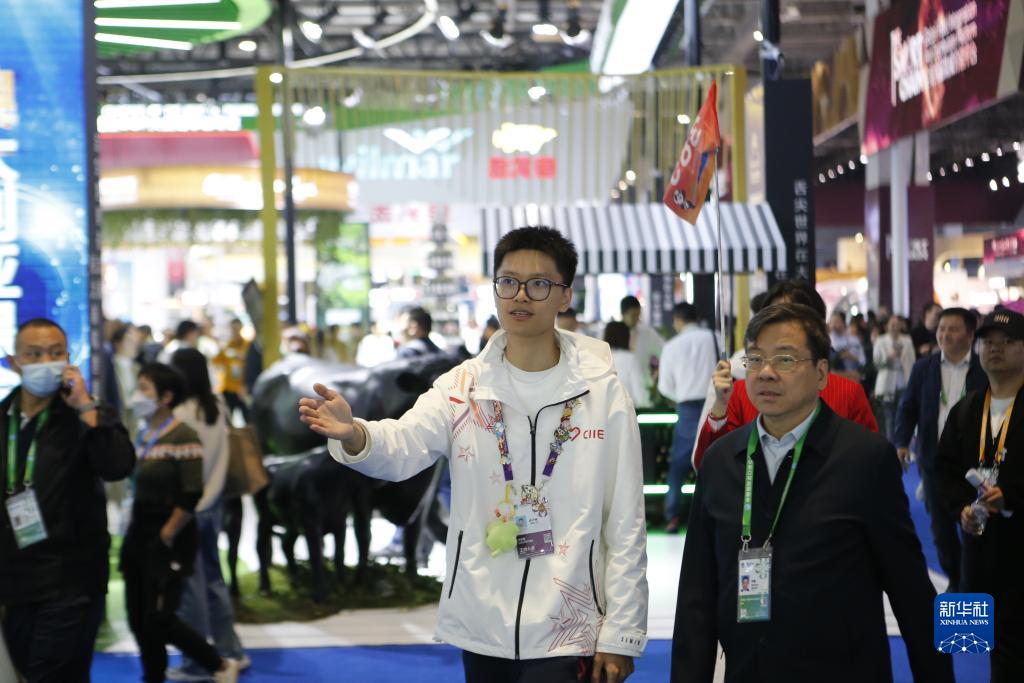 11月7日,在第六屆進(jìn)博會(huì )上,上海理工大學(xué)志愿者鄭子鋒(左)在引導交易團參觀(guān)。