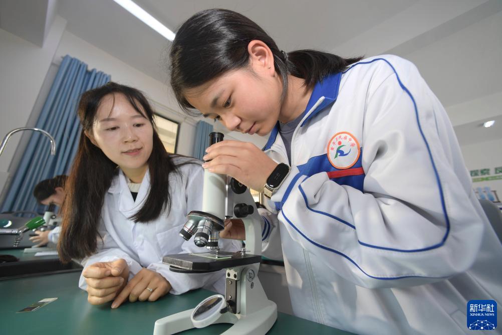 11月9日,在黃平民族中學(xué)實(shí)驗室,一名教師(左)帶領(lǐng)學(xué)生上實(shí)操課。