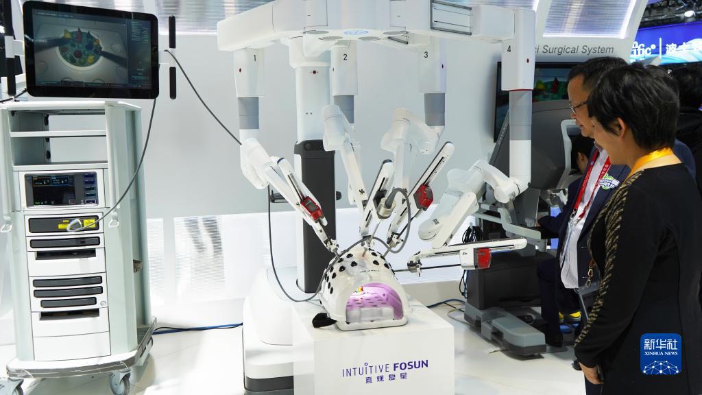 11月7日,在第六屆進(jìn)博會(huì )醫療器械及醫藥保健展區復星健康展臺,觀(guān)眾了解國產(chǎn)達芬奇手術(shù)機器人。
