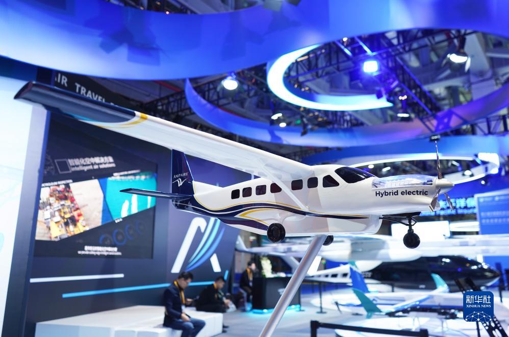 11月10日在第六屆進(jìn)博會(huì )汽車(chē)展區拍攝的安飛九座混動(dòng)飛機模型。