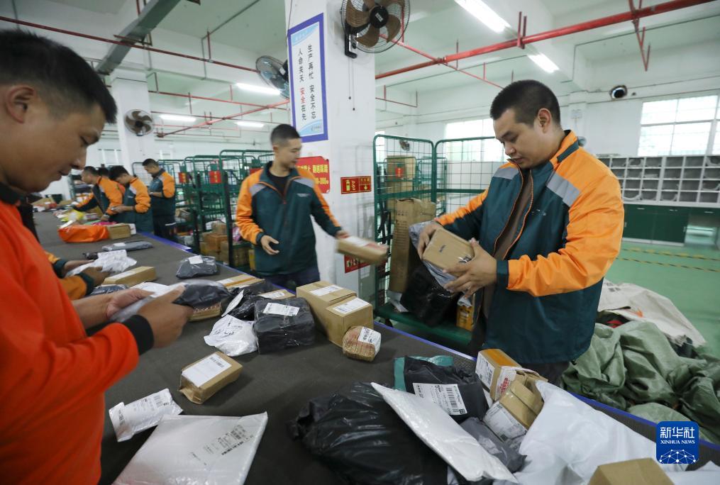 11月10日,在中國郵政集團有限公司湖南省資興市分公司郵件處理中心,工作人員在分揀包裹。