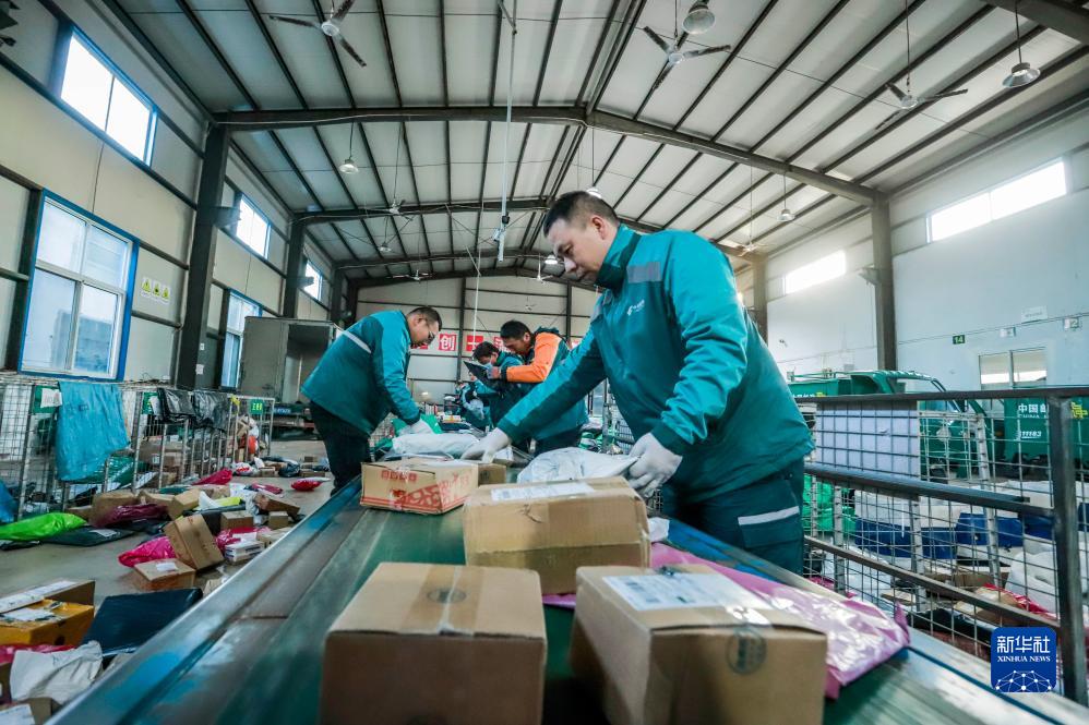 11月9日,河北省遵化市郵政快遞公司的工作人員在車(chē)間分揀收寄的快件。