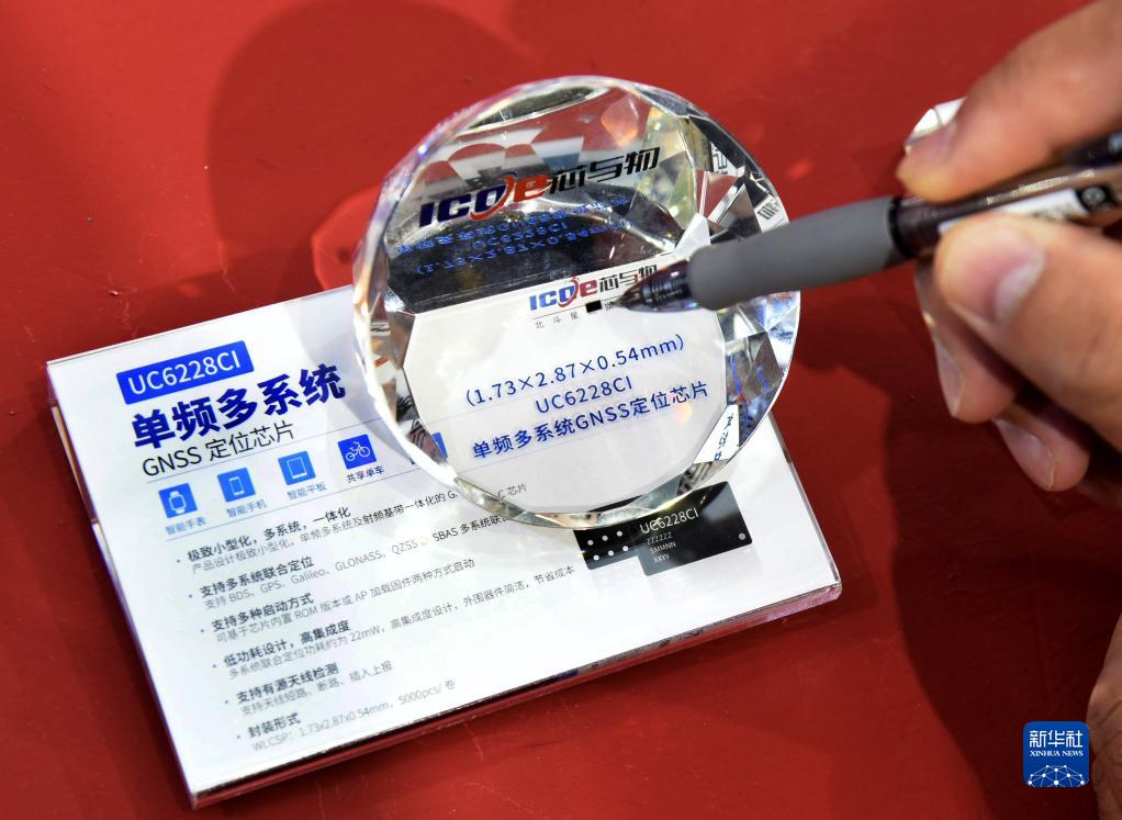 11月10日,一名參展商介紹基于北斗技術(shù)的國產(chǎn)微型定位芯片。