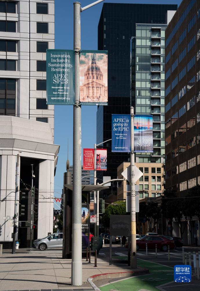 這是11月7日在美國舊金山拍攝的亞太經(jīng)合組織會(huì )議場(chǎng)地外的宣傳海報。