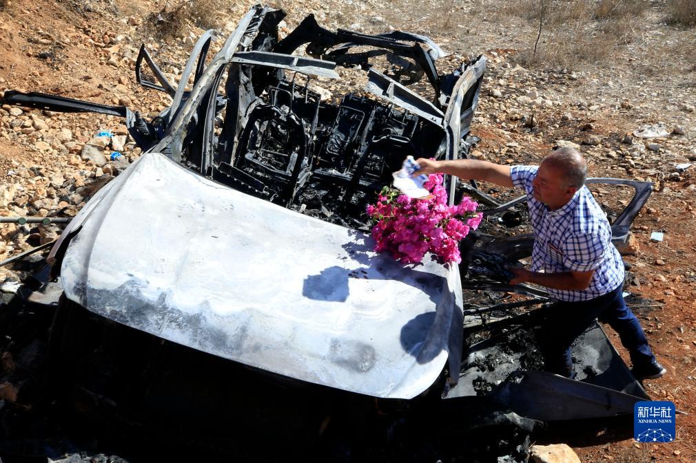 11月6日,在黎巴嫩南部艾納塔,遇難者的親屬將一束花放在被以色列無(wú)人機炸毀的車(chē)輛殘骸上。