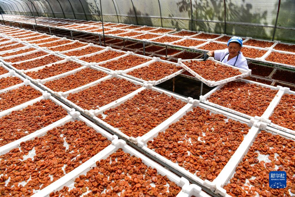 農民在貴州省龍里縣谷腳鎮高堡村晾曬刺梨果脯(9月1日攝)。