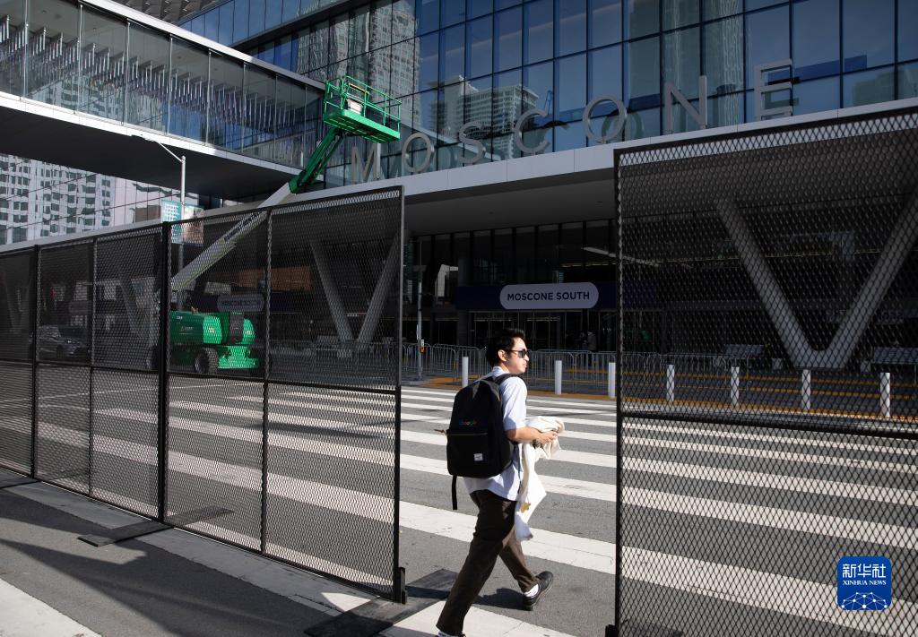 11月10日,在美國舊金山,一名男子走過(guò)亞太經(jīng)合組織會(huì )議場(chǎng)地外的金屬?lài)鷻凇?/p>
