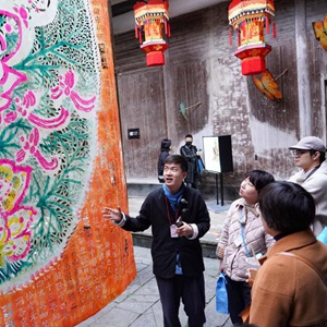 11月11日,參展藝術(shù)家(左一)在葉氏宗祠向觀(guān)眾介紹作品。