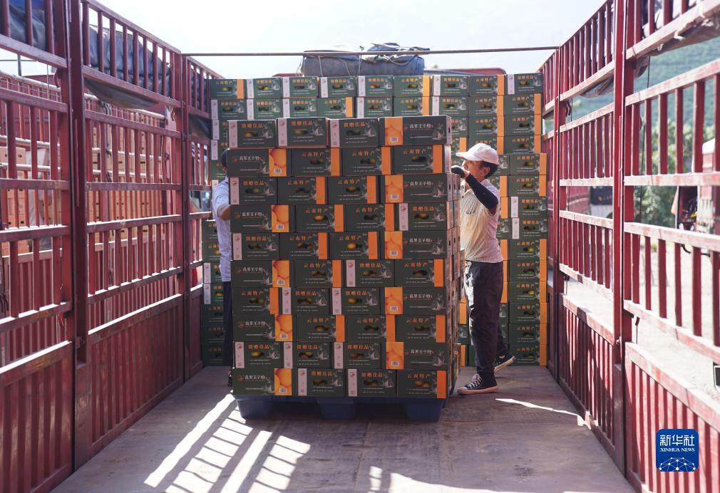 11月11日,在云南省新平縣戛灑鎮冰糖橙種植基地,村民將包裝好的冰糖橙裝車(chē)。