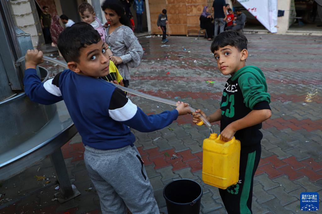 11月11日,兩名男孩在加沙地帶南部城市汗尤尼斯街頭打水。