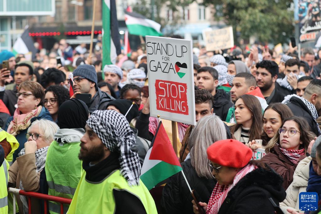 當日,眾多巴勒斯坦支持者在比利時(shí)布魯塞爾集會(huì ),呼吁盡快實(shí)現加沙?;?。