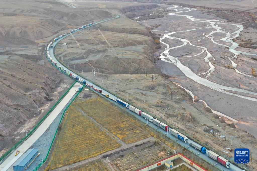 入境車(chē)輛有序進(jìn)入新疆伊爾克什坦口岸(11月7日攝,無(wú)人機照片)。
